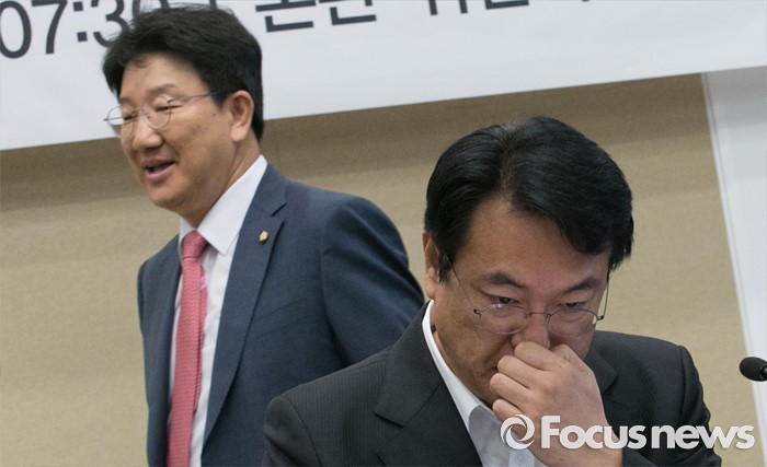 (서울=포커스뉴스) 24일 오전 서울 여의도 국회 귀빈식당에서 열린 2016년 하반기 경제정책방향 당정간담회에 참석한 정진석(오른쪽) 새누리당 원내대표 뒤로 권성동 법사위원장이 지나고 있다.