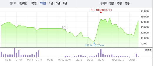 현대상선은 용선료 조정과 사채권자 채무재조정을 완료했기 때문에, 해운동맹만 가입하게 되면 채권단의 자율협약 조건을 다 갖추게 된다.주가흐름<사진출처=네이버 캡쳐>