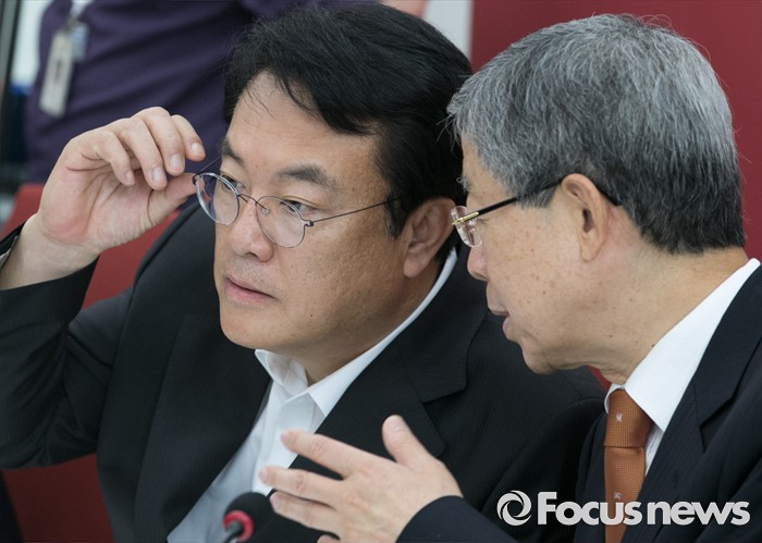 (서울=포커스뉴스) 24일 오전 서울 여의도 국회에서 열린 북한 미사일 발사 관련 국방부 현안보고에 참석한 김희옥(오른쪽) 새누리당 혁신비대위원장과 정진석 원내대표가 대화하고 있다.