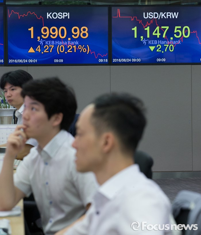 (서울=포커스뉴스) 영국의 유럽연합(EU) 탈퇴를 의미하는 '브렉시트' 국민 투표 개표가 진행되는 24일 오전 서울 중구 KEB 하나은행 명동 본점 딜링룸에서 딜러들이 업무를 보고 있다. 이날 코스피지수는 브리메인 기대에 2000p를 돌파했으나 다시 하락해 1900p대를 유지하고 있다.