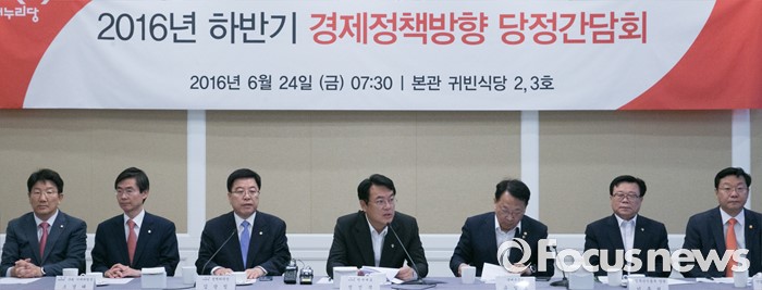 한편 이날 간담회에는 정진석 원내대표·김광림 정책취의장·조경태 기재위원장 등 여당 의원 30여명과 유일호 경제부총리·임종룡 금융위원장·주형환 산업부장관 등 정부 측 7명이 참석했다.(서울=포커스뉴스) 24일 오전 서울 여의도 국회 귀빈식당에서 열린 2016년 하반기 경제정책방향 당정간담회에 참석한 정진석 새누리당 원내대표가 인사말을 하고 있다. 왼쪽부터 권성동 법사위원장, 조경태 기재위원장, 김광림 정책위의장, 정 원내대표, 유일호 경제부총리, 이동필 농림축산식품부 장관, 주형환 산업통상자원부 장관. 2016.06.24 박동욱 기자 (서울=포커스뉴스) 24일 오전 서울 여의도 국회 귀빈식당에서 열린 2016년 하반기 경제정책방향 당정간담회에 참석한 유일호 경제부총리 겸 기획재정부 장관이 인사말을 하고 있다. 2016.06.24 박동욱 기자