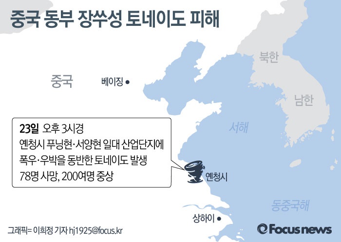 (서울=포커스뉴스) 23일 중국 옌청시 푸닝현과 서양현 일대 산업단지에 폭우·우박을 동반한 강력한 토네이도가 발생해 78명이 사망하고 200여명이 부상당했다.