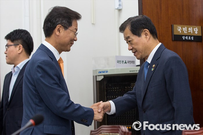 (서울=포커스뉴스) 천정배(왼쪽) 국민의당 공동대표가 24일 오전 서울 여의도 국회에서 황인무 국방부 차관에게 북한 미사일 발사 관련 현안보고 받기 전 악수 하고 있다.
