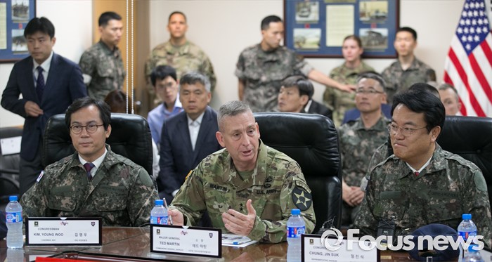 (의정부=포커스뉴스) 정진석(오른쪽) 새누리당 원내대표와 김영우(왼쪽) 국방위원장 등 의원들이 24일 오전 경기도 의정부 미2사단 한미연합사단을 방문해 부대 현황보고에 앞서 테드 마틴 미2사단장의 인사말을 듣고 있다.