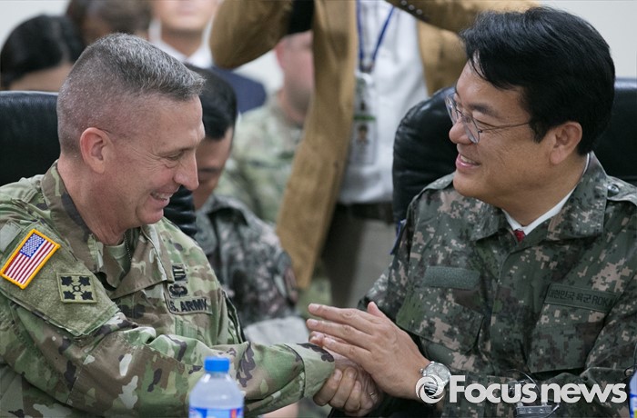 (의정부=포커스뉴스) 정진석(오른쪽) 새누리당 원내대표가 24일 오전 경기도 의정부 미2사단 한미연합사단을 방문해 부대 현황보고에 앞서 인사말을 마친 뒤 테드 마틴 미2사단장과 악수하고 있다.