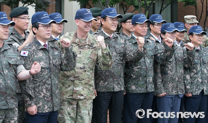 (의정부=포커스뉴스) 정진석 새누리당 원내대표와 김영우 국방위원장 등 의원들이 24일 오전 경기도 의정부 미2사단 한미연합사단을 방문해 테드 마틴 미2사단장 등 군 관계자들과 기념촬영을 하고 있다.
