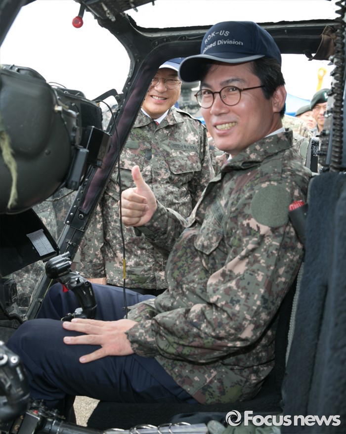 (의정부=포커스뉴스) 새누리당 소속 김영우 국회 국방위원장이 24일 오전 경기도 의정부 미2사단 한미연합사단을 방문해 부대현황 보고를 받은 뒤 카이오와 워리어 탑승체험을 하고 있다.
