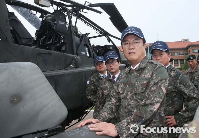 (의정부=포커스뉴스) 정진석 새누리당 원내대표, 김영우 국방위원장 등 의원들이 24일 오전 경기도 의정부 미2사단 한미연합사단을 방문해 부대현황 보고를 받은 뒤 아파치 헬기를 살펴보고 있다.
