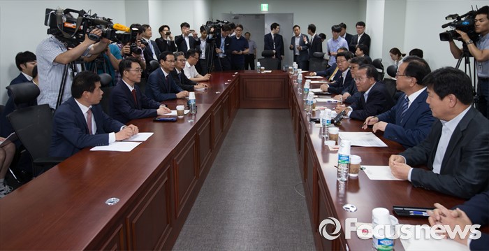 (서울=포커스뉴스) 24일 오후 서울 여의도 국회 의원회관에서 윤재옥 새누리당 대구시당 위원장, 김부겸 더불어민주당 의원, 홍의락 무소속 의원 등 여야 대구지역 의원들과 강호인 국토교통부 장관이 영남권 신공항 백지화 관련 면담을 하고 있다.
