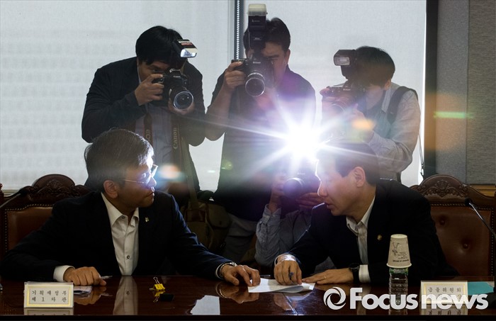 (서울=포커스뉴스) 24일 오후 서울 중구 전국은행연합회에서 최상목(왼쪽) 기획재정부 제1차관과 정은보 금융위원회 부위원장이 브렉시트 관련 긴급거시경제금융회의에 참석해 대화하고 있다.