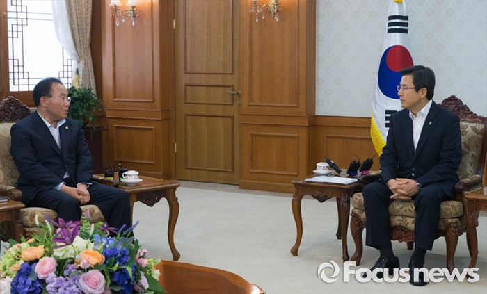 (서울=포커스뉴스) 황교안(오른쪽) 국무총리가윤재옥 새누리당 대구시당 위원장이 24일 오후 서울 종로구 정부서울청사에서 영남권 신공항 백지화 관련 대화하고 있다.