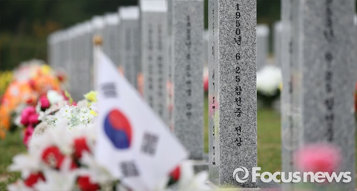 (대전=포커스뉴스) 6·25전쟁 66주년을 하루 앞둔 24일 오후 대전 유성구 국립대전현충원 6.25 전쟁 참전 용사의 묘비 앞에 태극기가 바람에 휘날리고 있다.