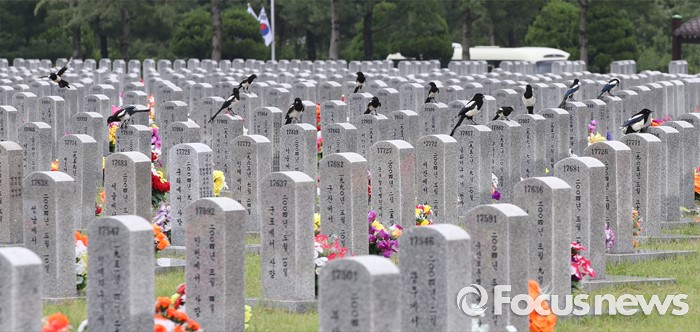 (대전=포커스뉴스) 6·25전쟁 66주년을 하루 앞둔 24일 오후 대전 유성구 국립대전현충원 사병 묘비에 수 십 마리의 까치가 앉아 있다.