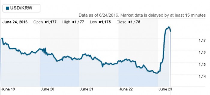 24일 서울 외환시장에서 원화 가치는 오전 후반부터 큰 폭으로 하락했다. 브렉시트를 지지하는 결과 비중이 유럽연합 잔류보다 높아지면서부터다.