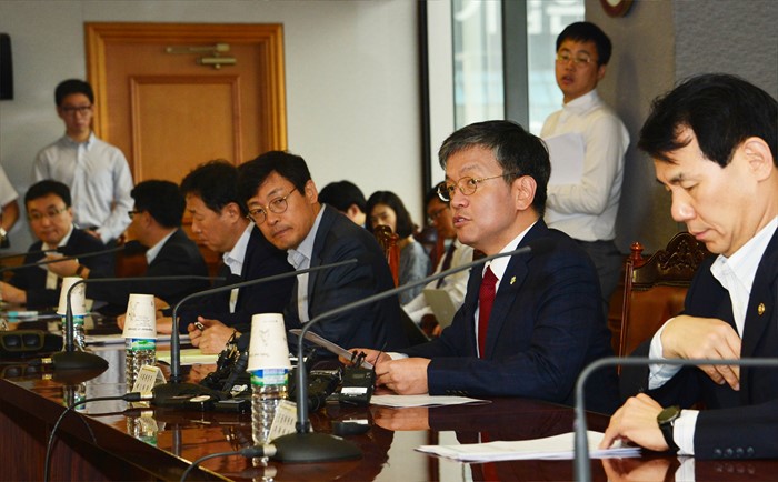 (서울=포커스뉴스) 최상목 기획재정부 차관이 6월 24일 서울시 중구 은행회관에서 열린 긴급 거시경제금융회의에 참석, 참석자들과 금일 브렉시트(Brexit ·영국의 EU 탈퇴 찬반 국민투표)와 관련해 대응방안을 논의 하고 있다(. <사진제공=기획재정부>