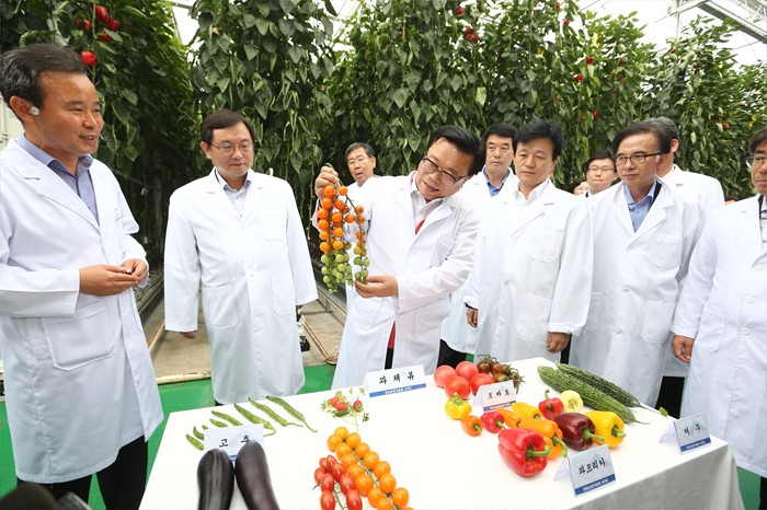 (진주=포커스뉴스) 이동필 농림축산식품부 장관이 24일 경남 진주시 경남도농업기술원 첨단농업에서 열린스마트 팜 확산 상반기 점검회의에 참석전 경남도농업기술원 'ATEC 첨단온실' 스마트 팜 재배 시설을 둘러보고 있다. <사진제공=농림축산식품부>