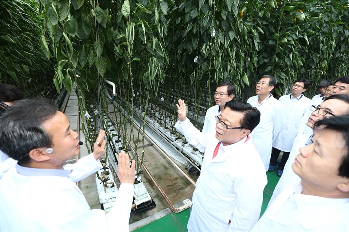 (진주=포커스뉴스) 이동필 농림축산식품부 장관이 24일 경남 진주시 경남도농업기술원 첨단농업에서 열린스마트 팜 확산 상반기 점검회의에 참석전 경남도농업기술원 'ATEC 첨단온실' 스마트 팜 재배 시설을 둘러보고 있다. <사진제공=농림축산식품부>