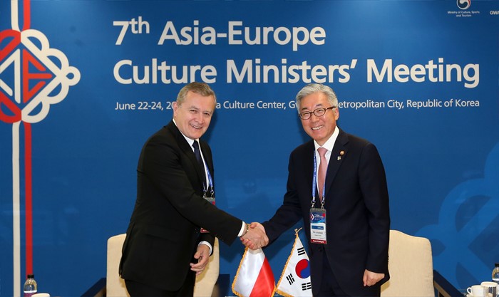(광주=포커스뉴스) 김종덕(오른쪽) 문화체육관광부 장관이 23일 제7차 ASEM 문화장관회의가 열리고 있는 광주시 동구 국립아시아문화전당에서 피오트르 글린스키(Piotr Gliński) 폴란드 부총리 겸 문화부 장관과 접견을 하고 있다. <사진제공=문화체육관광부>