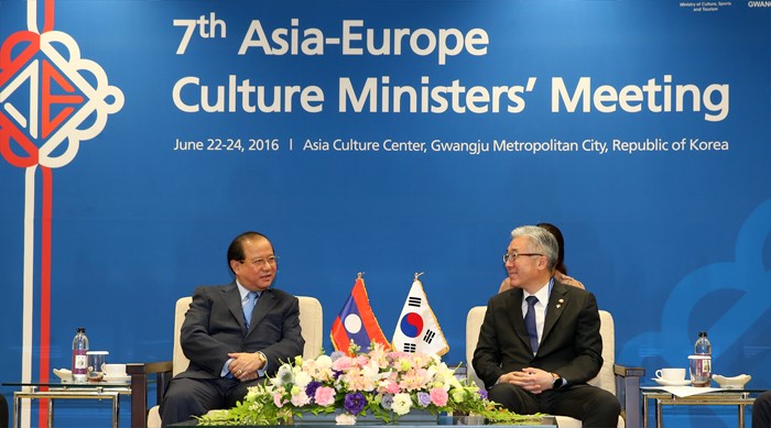 (광주=포커스뉴스) 김종덕(오른쪽) 문화체육관광부 장관이 24일 제7차 ASEM 문화장관회의가 열리고 있는 광주시 동구 국립아시아문화전당에서 보생캄 봉다라(Bosengkham Vongdara) 라오스 장관과 접견을 하고 있다. <사진제공=문화체육관광부>