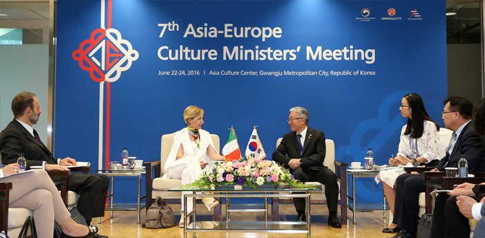 (광주=포커스뉴스) 김종덕 문화체육관광부 장관이 24일 제7차 ASEM 문화장관회의가 열리고 있는 광주시 동구 국립아시아문화전당에서 도리나 비안키(Dorina Bianchi) 이탈리아 차관과 접견을 하고 있다. <사진제공=문화체육관광부>