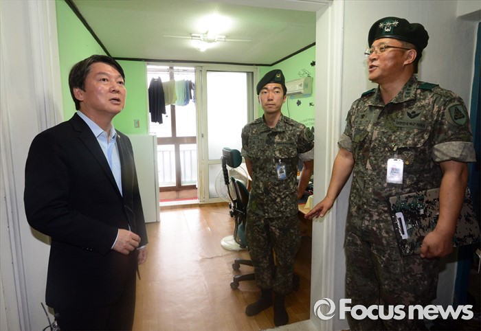 (의정부=포커스뉴스) 안철수(왼쪽) 국민의당 상임공동대표가 24일 오후 경기도 의정부 56사단의 한 부대를 방문해 군인 아파트 현장을 확인하고 격려하고 있다.