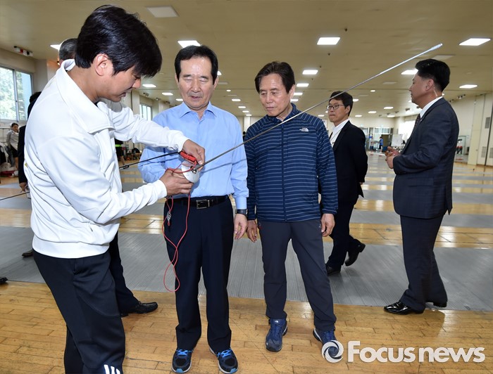 (서울=포커스뉴스) 정세균 국회의장이 24일 오후 서울 노원구 태릉선수촌을 방문해 브라질 리우 올림픽을 앞두고 훈련 중인 펜싱 국가대표 남현희 선수와 대결을 준비하고 있다.