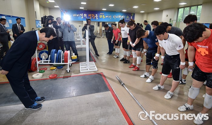 (서울=포커스뉴스) 정세균(왼쪽) 국회의장이 24일 오후 서울 노원구 태릉선수촌을 방문해 브라질 리우 올림픽을 앞두고 훈련 중인 역도 국가대표 선수들을 격려하고 있다.