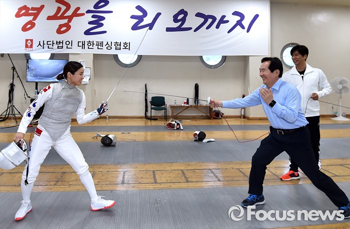 (서울=포커스뉴스) 정세균(오른쪽) 국회의장이 24일 오후 서울 노원구 태릉선수촌을 방문해 브라질 리우 올림픽을 앞두고 훈련 중인 남현희 선수와 펜싱 대결을 하고 있다.