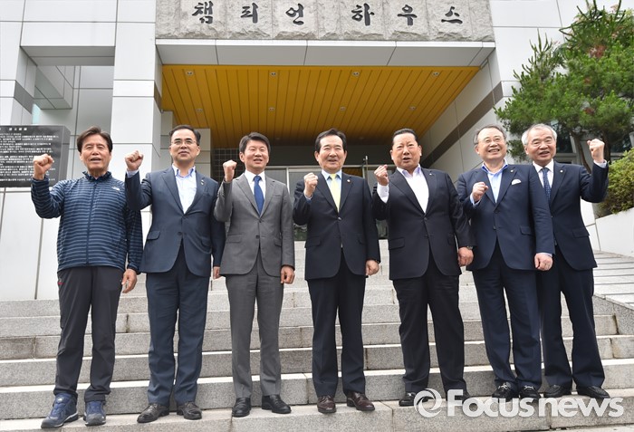 (서울=포커스뉴스) 정세균 국회의장이 24일 오후 서울 노원구 태릉선수촌을 방문해 브라질 리우 올림픽 준비위원회 관계자들과 기념촬영을 하고 있다. 왼쪽부터 최종삼 태릉선수촌장, 김종 문화체육관광부 2차관, 정몽규 올림픽 선수단장, 정 의장, 김정행 대한체육회장, 강영중 대한체육회장, 조영호 사무총장.
