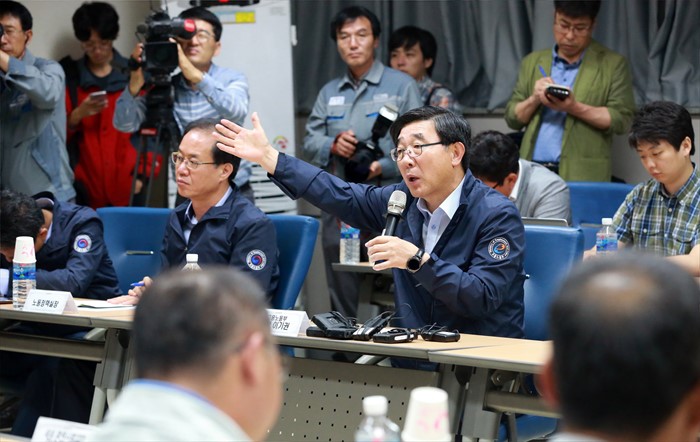 (거제=포커스뉴스) 이기권 고용노동부 장관이 24일 경남 거제를 방문하여 대우조선해양 및 삼성중공업 협력업체와 간담회를 갖고 업황 부진으로 어려움을 겪는 조선업 종사자 의견을 청취하고 있다. <사진제공=고용노동부>