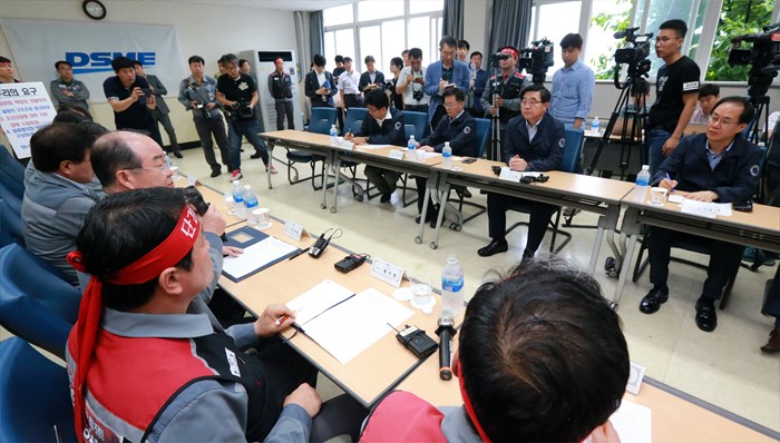 (거제=포커스뉴스) 이기권 고용노동부 장관이 24일 경남 거제 대우조선해양 노사와 간담회를 갖고 업황 부진으로 어려움을 겪는 조선업 종사자 의견을 청취하고 있다. <사진제공=고용노동부>