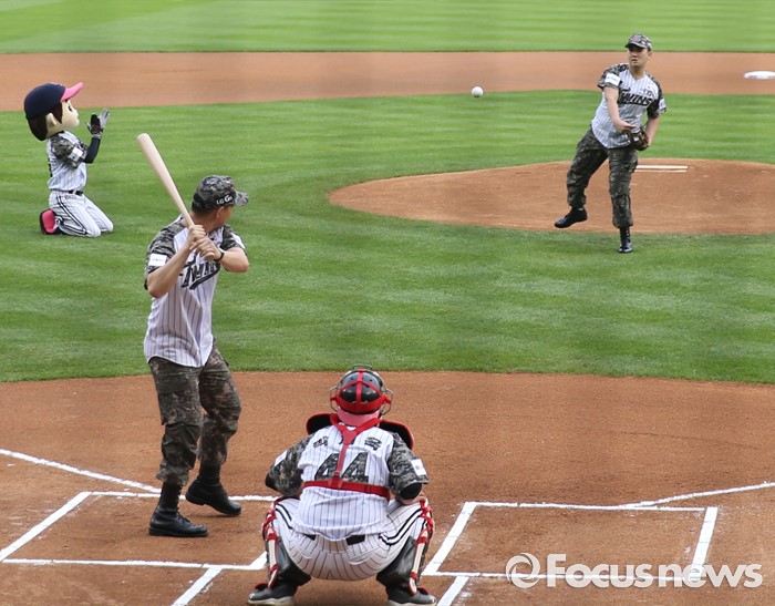(서울=포커스뉴스) 24일 서울 잠실구장에서 열린 2016 프로야구 넥센-LG 경기에 앞서 6.25전쟁 발발 66주년을 맞아 '땡큐 솔저스' 행사를 갖고 북한의 지뢰 도발로 부상당한 하재헌 하사가 시구, 김정원 하사가 시타하고 있다.있다.