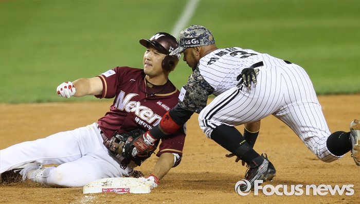 (서울=포커스뉴스) 24일 서울 잠실구장에서 열린 2016 프로야구 넥센-LG 경기 5회초 2사 3루에서 넥센 이택근이 우중간 펜스 앞에 떨어지는 안타를 치고 3루까지 달리다 LG 히메네스에게 태그아웃되고 있다.
