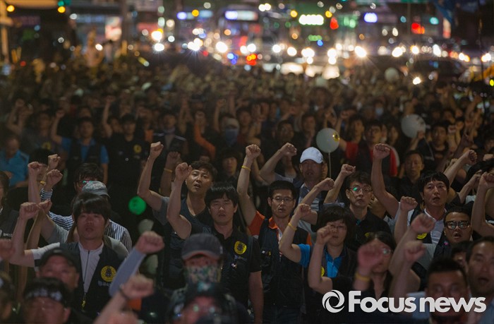 (서울=포커스뉴스) 24일 오후 서울 서초구 현대자동차 본사 앞에서 열린 '유성기업 故 한광호씨 100일ㆍ현대차 진격의 날' 집회에 참석한 노동자들이 구호를 외치고 있다.