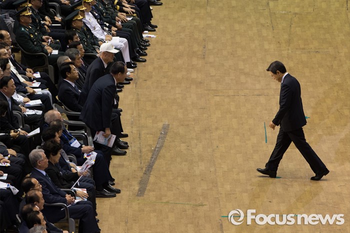(서울=포커스뉴스) 25일 오전 서울 송파구 잠실실내체육관에서 열린 '6.25전쟁 66주년 기념식'에 참석한 황교안(오른쪽) 국무총리가 기념사를 마치고 자리로 돌아가자 박승춘(왼쪽) 국가보훈처장이 일어서서 맞이하고 있다.