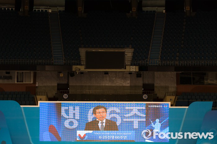 (서울=포커스뉴스) 25일 오전 서울 송파구 잠실실내체육관에서 열린 '6.25전쟁 66주년 기념식'에 참석한 황교안 국무총리가 기념사를 하고 있다.