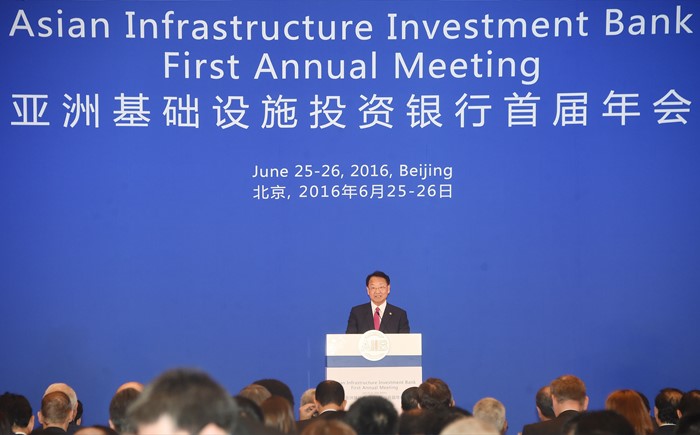 (서울=포커스뉴스) 유일호 부총리 겸 기획재정부 장관이 25일 중국 북경 월드호텔에서 열린 '제1차 아시아인프라개발은행(AIIB) 연차총회' 참석해 기조연설을 하고 있다. <사진제공=기획재정부>