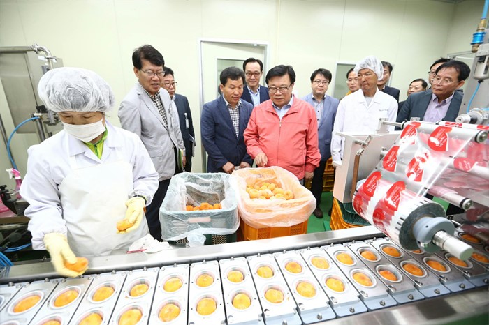 (청도=포컷뉴스) 이동필 농림축산식픔부 장관이 25일 경북 청도군 감 클러스터 사업단 현장을 찾아 운영현황을 점검하고청도반시로 만드는 아이스 홍시 등 청도 특산품 생산 시설을 둘러보고 있다. <사진제공=농림축산식품부>