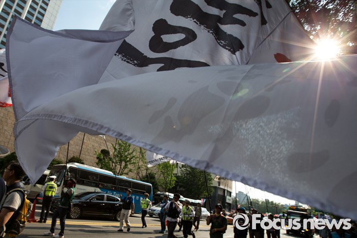 (서울=포커스뉴스) 25일 오후 서울 중구 시청광장에서 열린 '민주노총 전국노동자대회' 참석자들이 최저임금 1만원, 비정규직 철폐를 촉구하며 행진하고 있다.