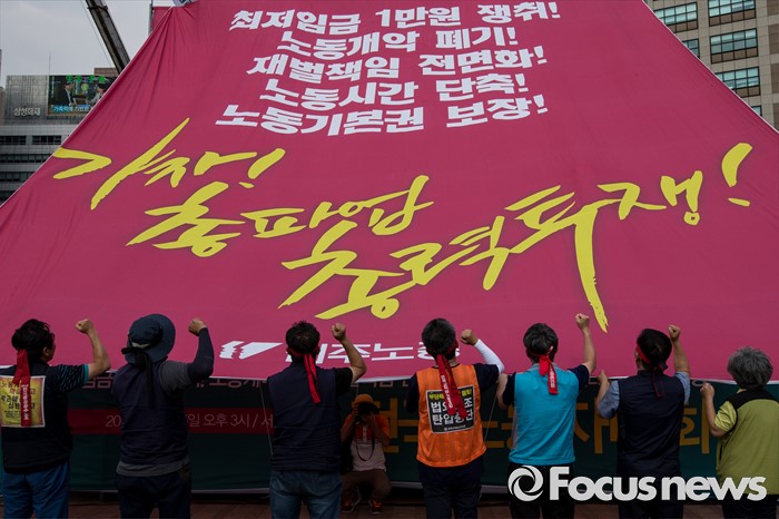 (서울=포커스뉴스) 25일 오후 서울 중구 시청광장에서 열린 '민주노총 전국노동자대회' 참석자들이 최저임금 1만원, 비정규직 철폐를 촉구하며 행진하고 있다.