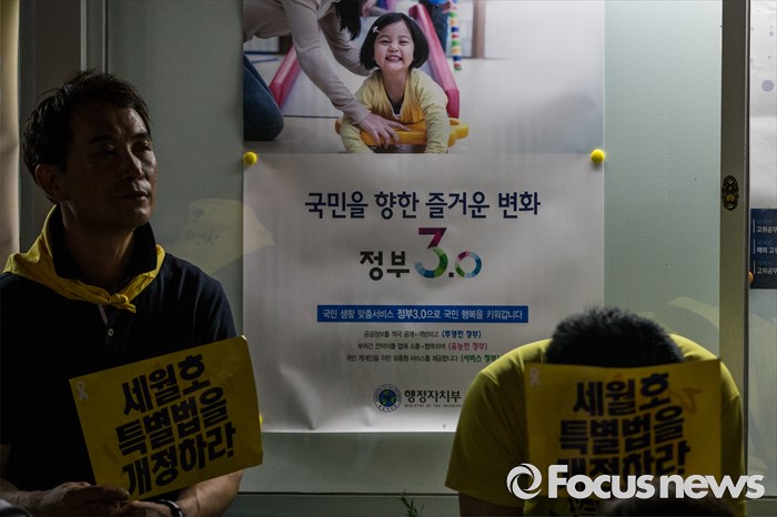 (서울=포커스뉴스) 25일 오후 서울 종로구 서울정부청사 앞에서 세월호 가족협의회 및 시민들이 세월호 특별법 개정과 온전한 인양을 촉구하며 농성을 벌이고 있다.