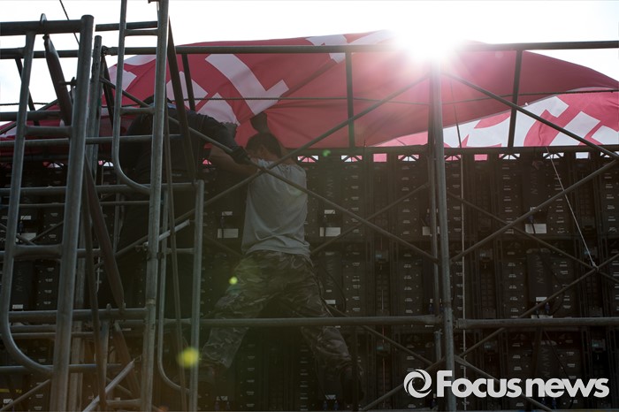 (서울=포커스뉴스) 25일 오후 서울 중구 시청광장에서 열린 '민주노총 전국노동자대회'에서 한 관계자가 무대준비를 하고 있다.