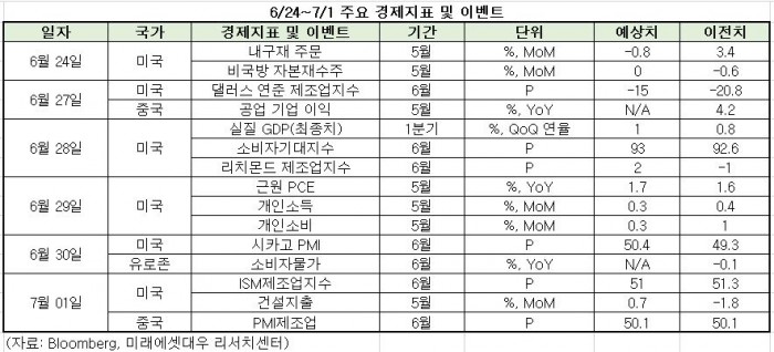 이번주 주목할 이벤트와 경제지표는 △미국 6월 공급관리자협회(ISM) 제조업 지수 발표 △중국 6월 제조업구매자관리지수(PMI) 발표 등이 있다.