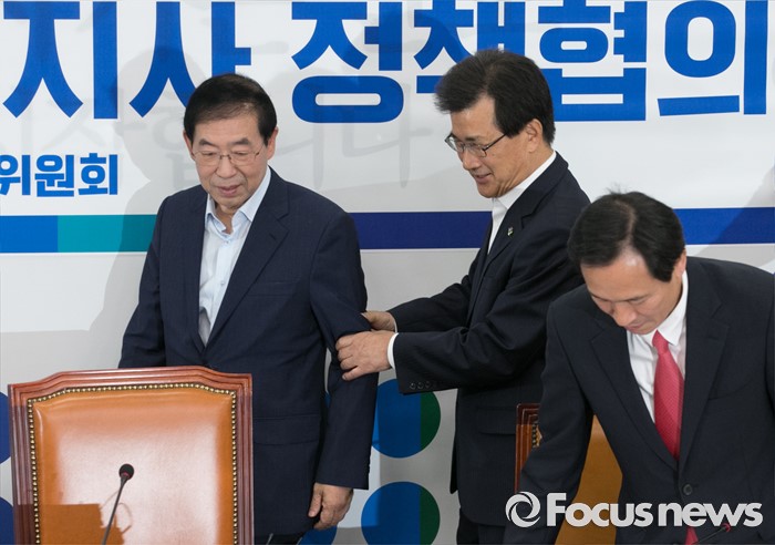 (서울=포커스뉴스) 26일 오전 서울 여의도 국회에서 열린 더불어민주당 시도지사 정책협의회에 참좋은지방정부위원회 공동위원장인 박원순(왼쪽부터) 서울시장과 이시종 충북도지사, 우상호 원내대표가 참석하고 있다.