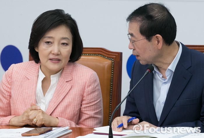 (서울=포커스뉴스) 26일 오전 서울 여의도 국회에서 열린 더불어민주당 시도지사 정책협의회에 참석한 참좋은지방정부위원회 공동위원장인 박영선(왼쪽) 의원, 박원순 서울시장이 대화하고 있다.