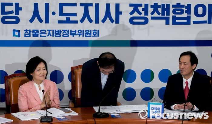 (서울=포커스뉴스) 26일 오전 서울 여의도 국회에서 열린 더불어민주당 시도지사 정책협의회에 참석한 참좋은지방정부위원회 공동위원장인 박원순(가운데) 서울시장이 인사하고 있다.
