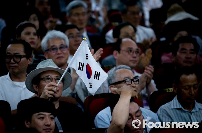 (서울=포커스뉴스) 26일 오후 서울 여의도 국회 의원회관에서 열린 미래로 가는 바른 역사 협의회 발대식 및 식민사학 규탄대회에 한 참석자가 태극기를 흔들고 있다.