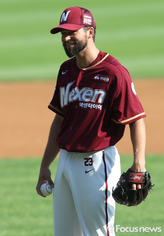 (서울=포커스뉴스) 26일 서울 잠실구장에서 열린 2016 프로야구 넥센-LG 경기 1회말 1사1루에서 넥센 투수 맥그레거가 주심의 보크 판정에 멋적은 웃음을 짓고 있다.