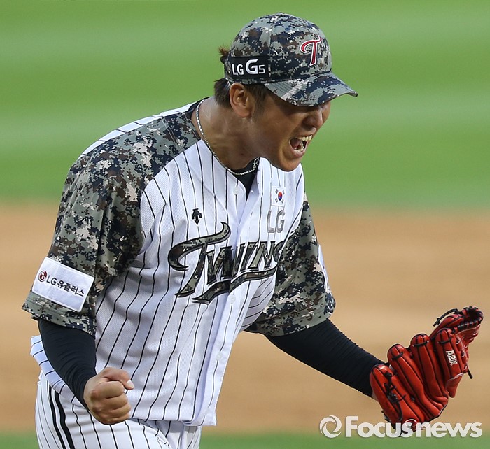 (서울=포커스뉴스) 26일 서울 잠실구장에서 열린 2016 프로야구 넥센-LG 경기 9회초 2사 만루에서 넥센 임병욱을 삼진 아웃시키며 승리를 지킨 LG 신승현이 주먹을 불끈 쥐며 환호하고 있다.