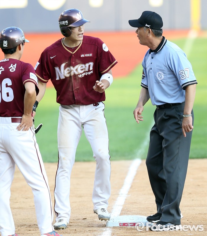 (서울=포커스뉴스) 26일 서울 잠실구장에서 열린 2016 프로야구 넥센-LG 경기 8회초 넥센 3루주자 임병욱이 김병주 3루심에게 2루 공과 판정에 항의하고 있다.
